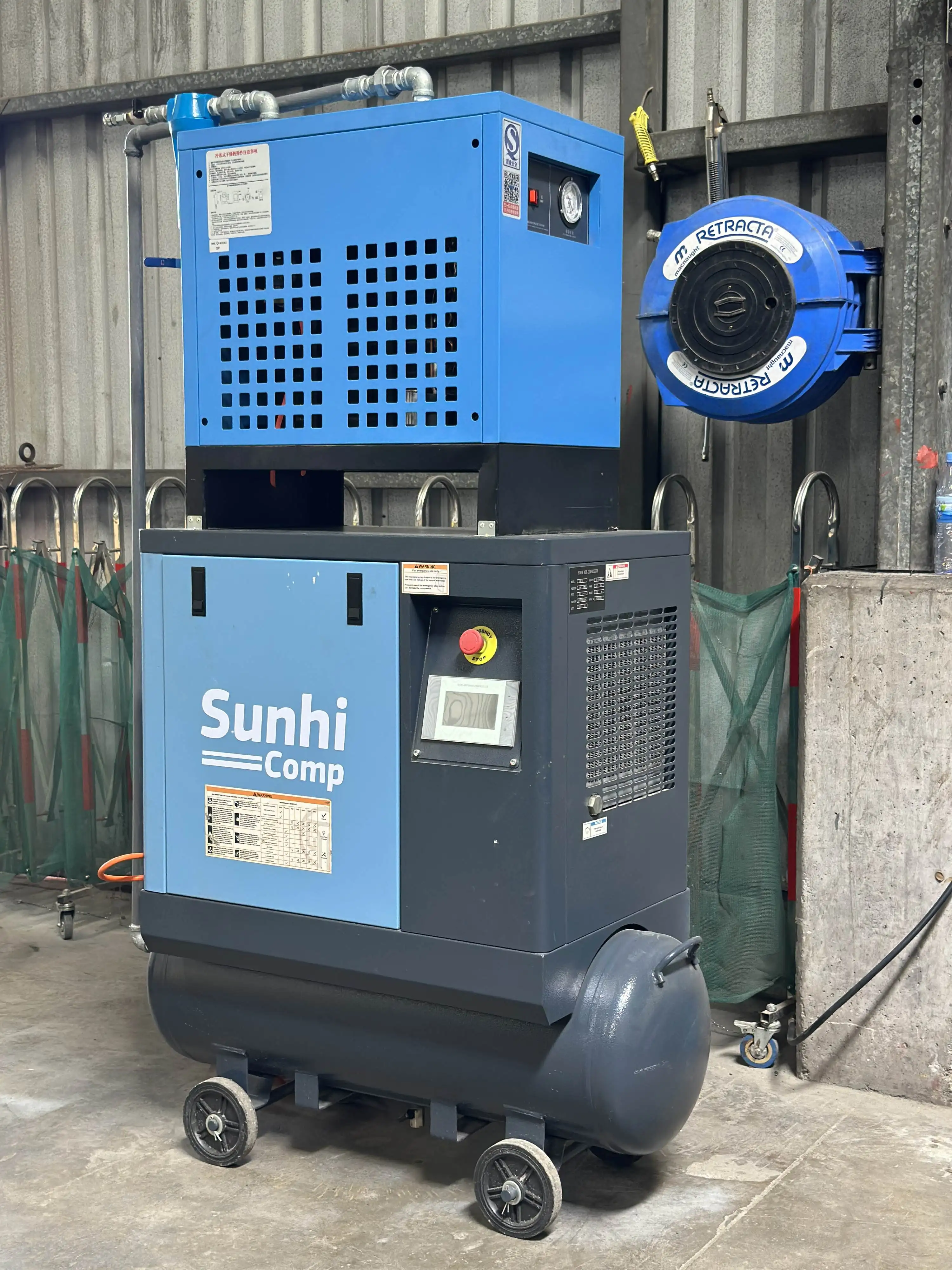 This project involves the procurement of various air compressor equipment, including screw air compressors (both fixed speed and variable frequency), air storage tanks, refrigerated dryers, precision filters, automatic drains, and aluminum alloy pipeline installations. The equipment is supplied by Zhejiang Sunhi-Mach Co., Ltd., and was installed and commissioned at the buyer's designated location.